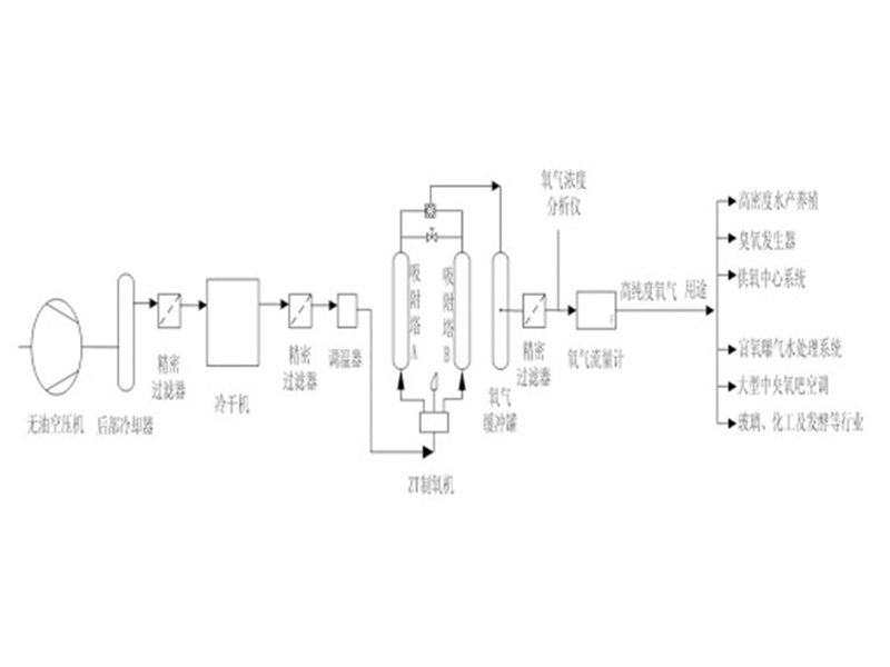 空氣主要由氮氣(78%)、氧氣(21%)和少量其它氣體(占1%)組成,本裝置旨在利用先進的分子篩物理吸附和解吸技術(shù)微電腦數(shù)碼測控技術(shù)相結(jié)合,實現(xiàn)制氧機內(nèi)裝填進口分子篩,在加壓時可將空氣中氮氣吸附,剩余的未被吸附的氧氣被收集起來,經(jīng)過凈化處理后即成為高純度的氧氣。分子篩在減壓時將所吸附的氮氣排放回環(huán)境空氣中,在下一次加壓時又可以吸附氮氣并制取氧氣,整個過程為周期性的動態(tài)循環(huán)過程,分子篩不消耗。系統(tǒng)原料為環(huán)境空氣,除空壓機和冷干機耗電外,再無其它消耗原料??山档褪褂酶邏貉鹾脱鯕馄康馁M用和危險,免去更換氧氣瓶的復(fù)雜過程,及時安全提供純潔、穩(wěn)定、可靠、低成本的氧氣,是目前較經(jīng)濟的供氧設(shè)備。