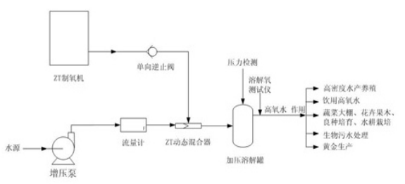 氧氣難溶于水(通常水中僅有幾mg/L含量),不能滿足日益增長的水產(chǎn)高密度養(yǎng)殖、水耕作物栽培、蔬菜大棚、苗木花卉、禽畜養(yǎng)殖等高效農(nóng)業(yè)領(lǐng)域。本裝置利用加壓動態(tài)強制混合技術(shù)并在線數(shù)碼測控溶解氧數(shù)值實行可靠高氧水連續(xù)的制造,其設(shè)備性能和市場化率居國內(nèi)較高水平,溶解氧數(shù)值可達幾十mg/L,高氧水處理量10m3~100m3/h??煽朔壳俺S玫娘L機、葉輪式增氧機、電磁式空氣壓縮機等曝氣充氧式溶氧效果差、運轉(zhuǎn)費用高等缺點,特別是對水產(chǎn)高密度養(yǎng)殖業(yè)的發(fā)展起到歷史性的推動作用。