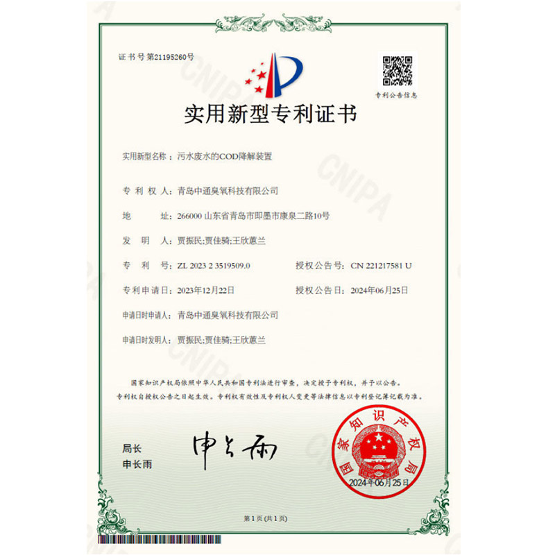 一種大型氧發(fā)生器冷卻水系統(tǒng)冷源回收循環(huán)利用裝置 一種催化氧化臭氧除臭系統(tǒng) 一種難降解工業(yè)廢水的處理工藝及裝置 異臭味氣及揮發(fā)性有機(jī)物凈化除臭裝置 污水廢水的COD降解裝置 一種大型臭氧發(fā)生器冷卻水系統(tǒng)冷源回收循環(huán)利用裝置 一種生活污水資源化利用快速處理裝置 一種具有水循環(huán)冷卻結(jié)構(gòu)的臭氧發(fā)生器 一種染料廢水處理臭氧發(fā)生器成套裝置 一種高級氧化垃圾滲濾處理用臭氧發(fā)生器 中通軟著 中通軟著 中通軟著 中通軟著 中通軟著 中通軟著 中通軟著 中通軟著 中通軟著 中通軟著 中通軟著 中通軟著 中通軟著